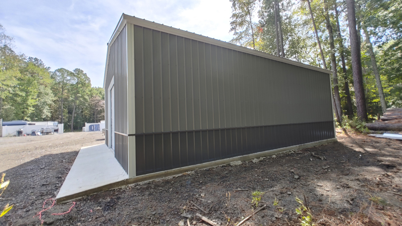 Metal garage 30' wide, 35' long, 12' wall height, with vertical roofing (the corrugation of the metal runs from building ridge to eave), which allows for snow and tree litter to slide off, vertical siding, two 10' x 10' roll up doors with header seals, steel 6 panel walk in door, charcoal wainscoting, and colored screws. The vertical siding has girts for added support. The roof and side paneling are pewter gray, with charcoal wainscoting and bright white trim. It is certified for 140mph wind gust and 30 psf snow load (can be upgraded to 150/35). The concrete and site work is a separate cost not included in the building price, but please contact us if you would like a quote for just a building or concrete as well.